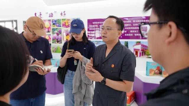 张小敏在粤伽新梅产业园向媒体介绍当地法院加强国家地理标志产品司法协同保护相关举措