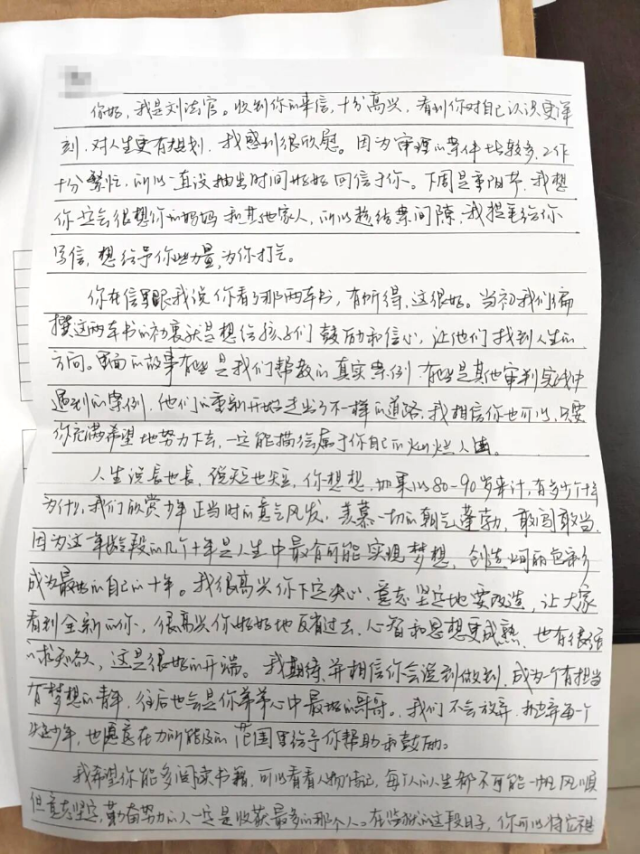 刘景景的帮教方式中,信件有着特殊的分量。她认为,少年审判工作应当遵循“教育为主,惩罚为辅”的原则,而书信,正是能够让迷途少年感受到关怀、重寻人生方向的桥梁。