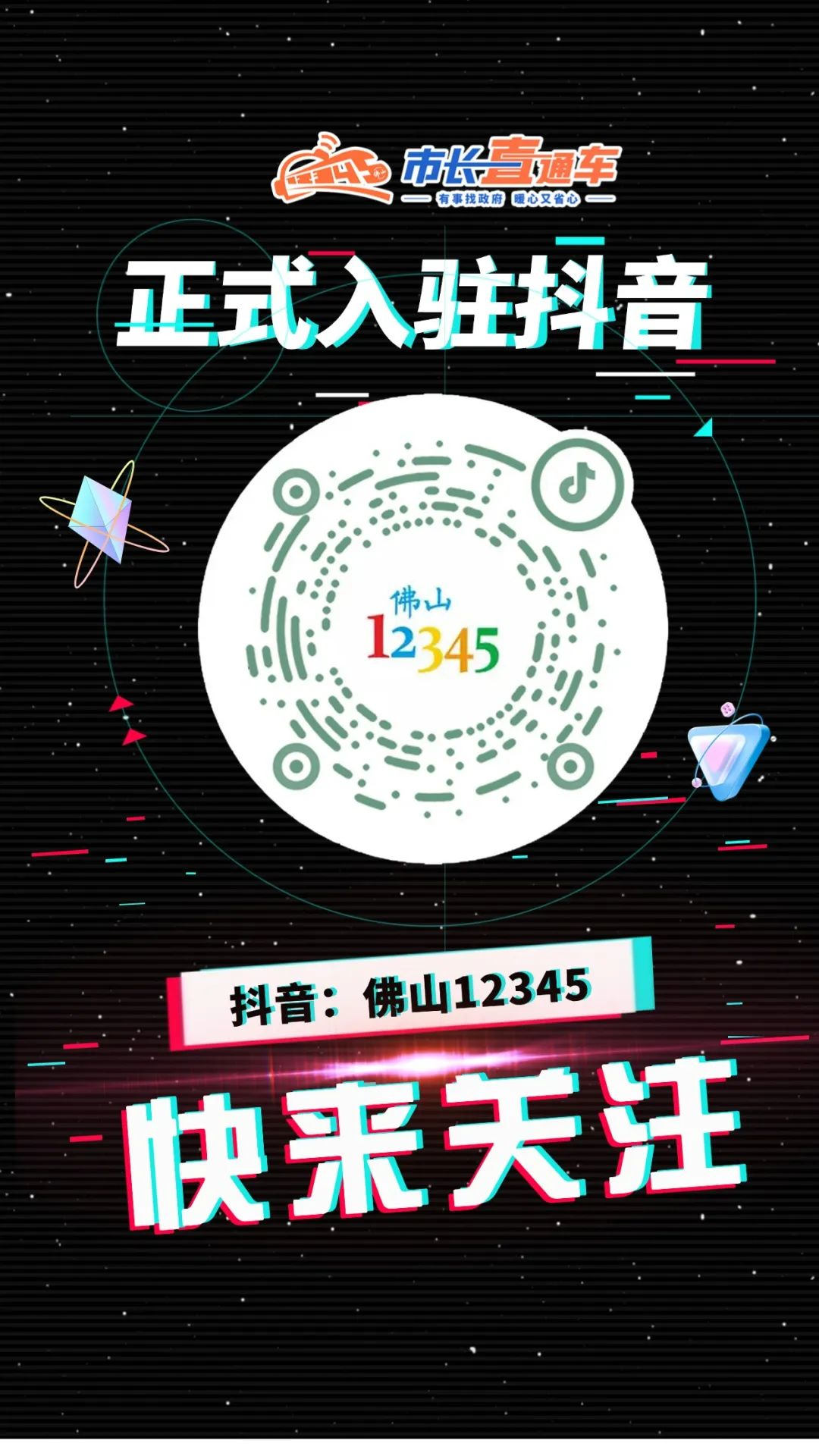 按捺不住激动的心情 要告诉大家一个好消息 佛山12345官方认证抖音号开通啦! 以后除了公众号、视频号、小程序以外 大家多了一个获取政务知识的渠道 抖音名:佛山12345 抖音号:85617484814 佛山12345抖音号将作为佛山政府服务的新窗口,通过生动有趣的短视频形式,展现佛山城市魅力,传递正能量,让政务服务更贴近民生,让市民生活更加便捷高效。 那么,怎么找到我们呢? 快来看看! 方法一 输入框搜索关注 打开“抖音”App,在搜索框输入“佛山12345”或抖音号“85617484814 ”。 方法二 扫描二维码关注 保存下方图片,打开“抖音”App,点击左上方“扫一扫”,扫描二维码关注。 大家快来关注我们吧! 希望我们的关注列表里有你! 让我们在抖音里相遇 一起“抖”起来! 期待你关注互动的小心心哟~