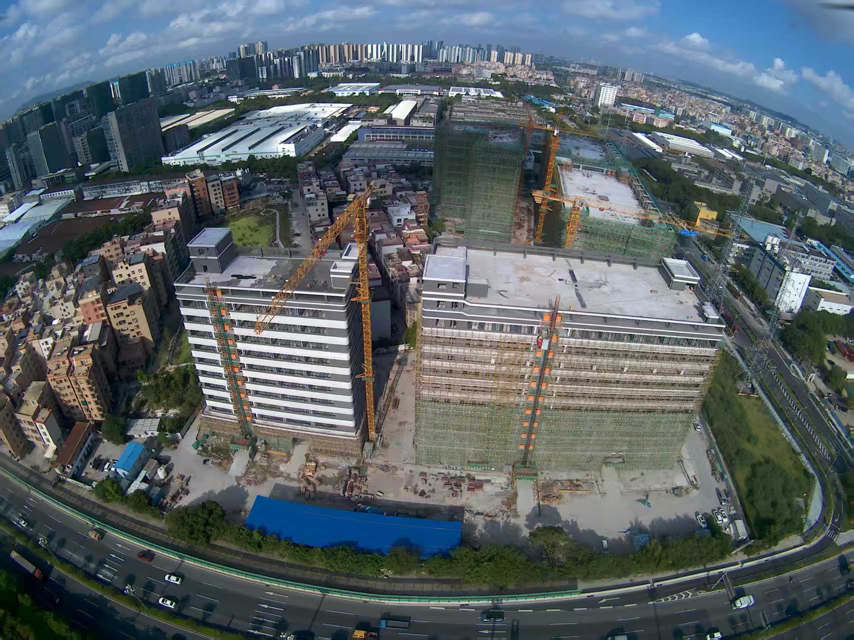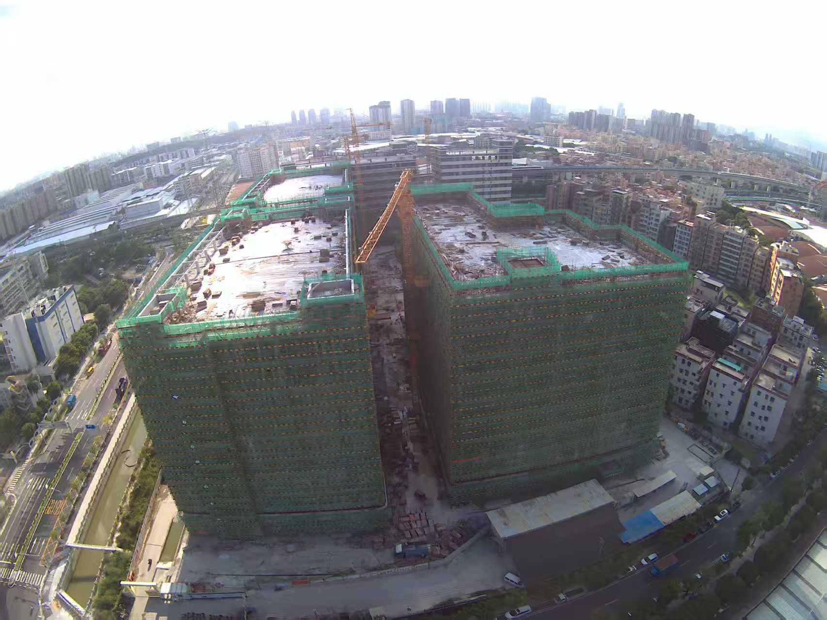 用无人机围绕海口智能科技园一周可见,项目的五栋高层厂房均已封顶,部分外架正在拆除,建设进入内部装修阶段。