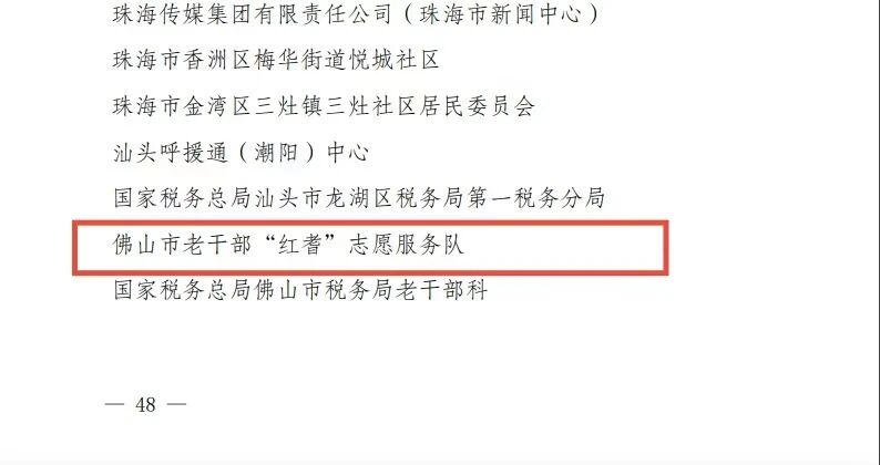10月29日重阳节当天,全国老龄工作委员会办公室印发《全国老龄工作委员会办公室关于表彰全国“敬老文明号”和全国“敬老爱老助老模范人物”的决定》,佛山市老干部“红耆”志愿服务队荣获全国“敬老文明号”。