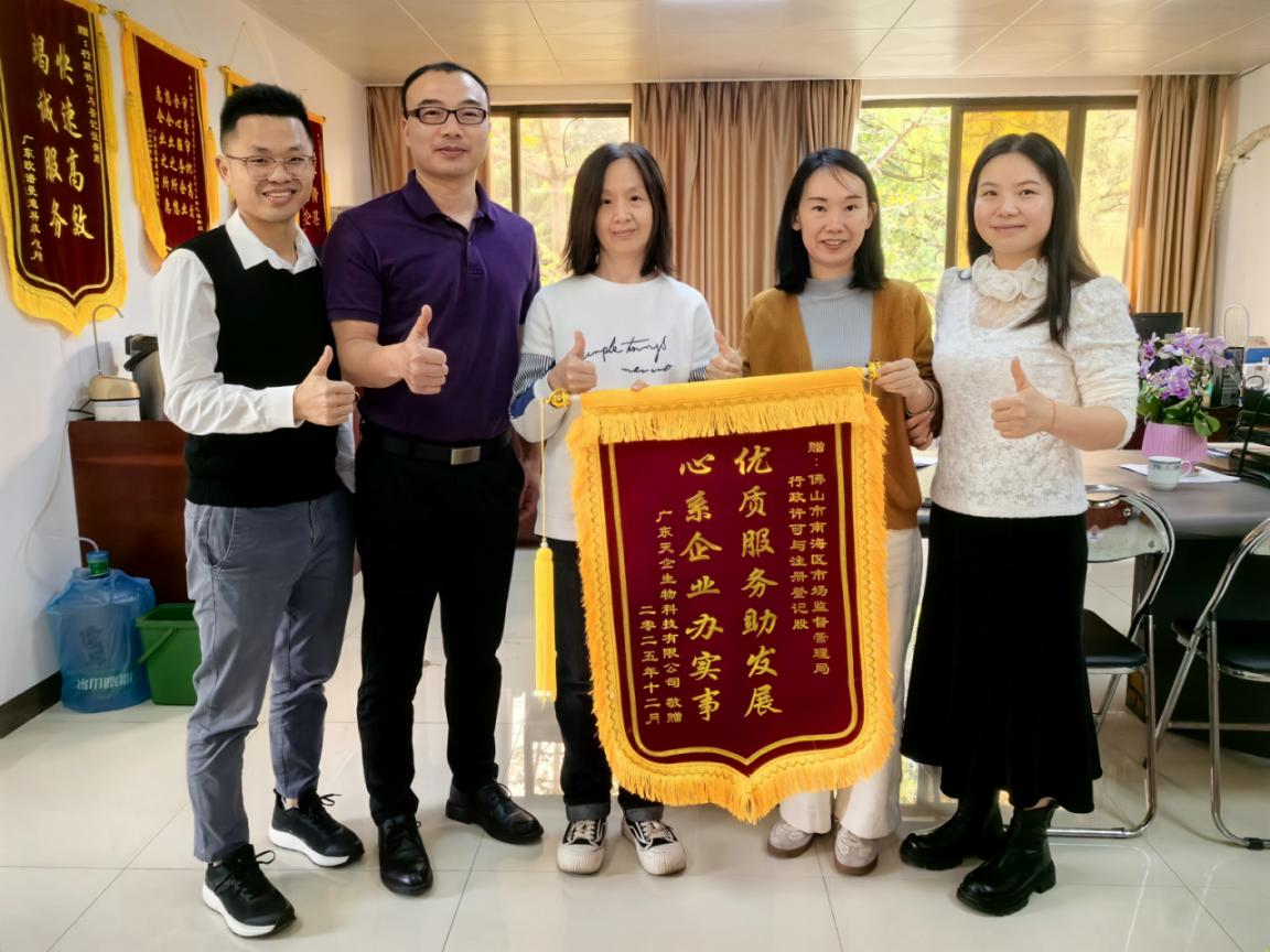 2025年12月30日,南海区市场监管局迎来温馨一幕,广东天企生物科技有限公司一行人专程来到股室,将一面印有“优质服务助发展,心系企业办实事”字样的锦旗送到办事人员手中,并附上一封感谢信,对行政许可与登记注册股曹孟谊同志在2025年期间三次协助企业办理食品生产许可证过程中提供的专业、耐心、高效服务表示衷心感谢。