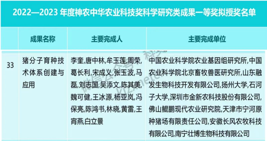 不仅如此,鲲鹏院作为主要完成单位、唐中林研究员为第二完成人的“猪分子育种技术体系创建与应用”项目,荣获2022-2023年度神农中华农业科技奖科学研究类成果一等奖。