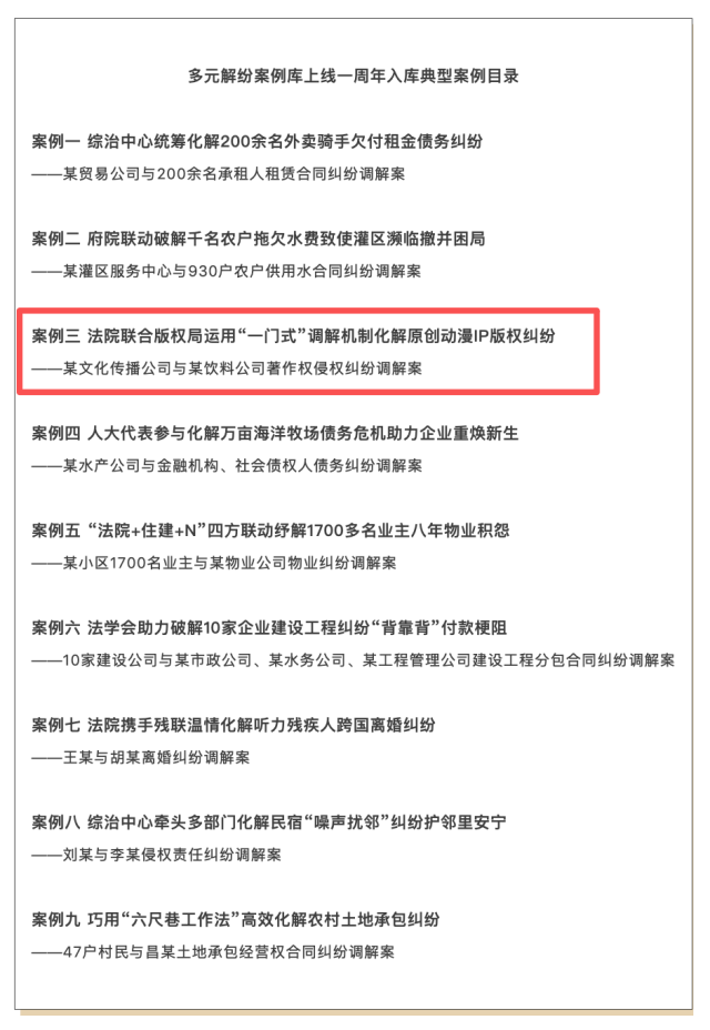 佛山版权纠纷调解再添“国字号”荣誉!近日,最高人民法院公布多元解纷案例库上线一周年入库典型案例,佛山调解动漫IP侵权纠纷案件成功入选。该案是此次评选中全国唯一入选的版权领域案例,也是广东省入选唯一案例,充分彰显了佛山版权纠纷多元化解模式的全国示范价值。