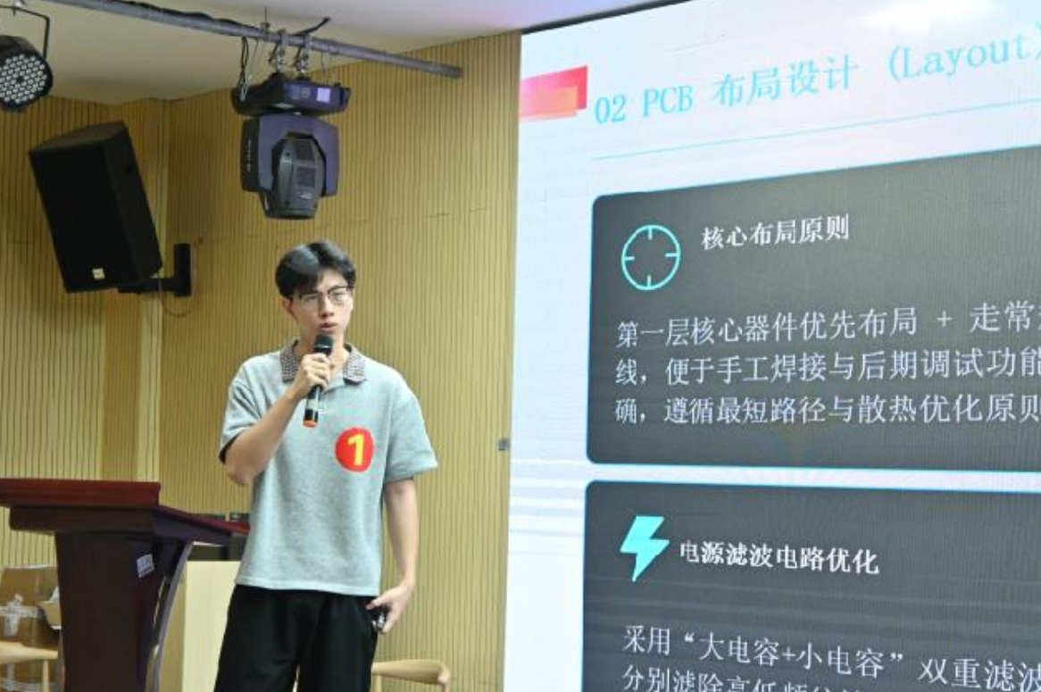 答辩现场更是成为学生展示专业能力的舞台,参赛学生不仅要清晰展示作品的设计思路、实现路径与创新亮点,更要直面企业技术负责人的专业提问。面对评委的“灵魂拷问”,选手们从容应答:“针对企业提出的要求,我们创新采用功能分区+地平面分割方案,将音频小信号区、D类功率区、DC-DC电源区进行物理隔离,从根源上避免串扰问题,在兼顾音质与 EMC性能的同时,实现了便携音响低失真、高效率、高稳定性的设计目标。”专业的表述、扎实的设计,充分展现了佛大学子将理论知识转化为实践能力的过硬素养。