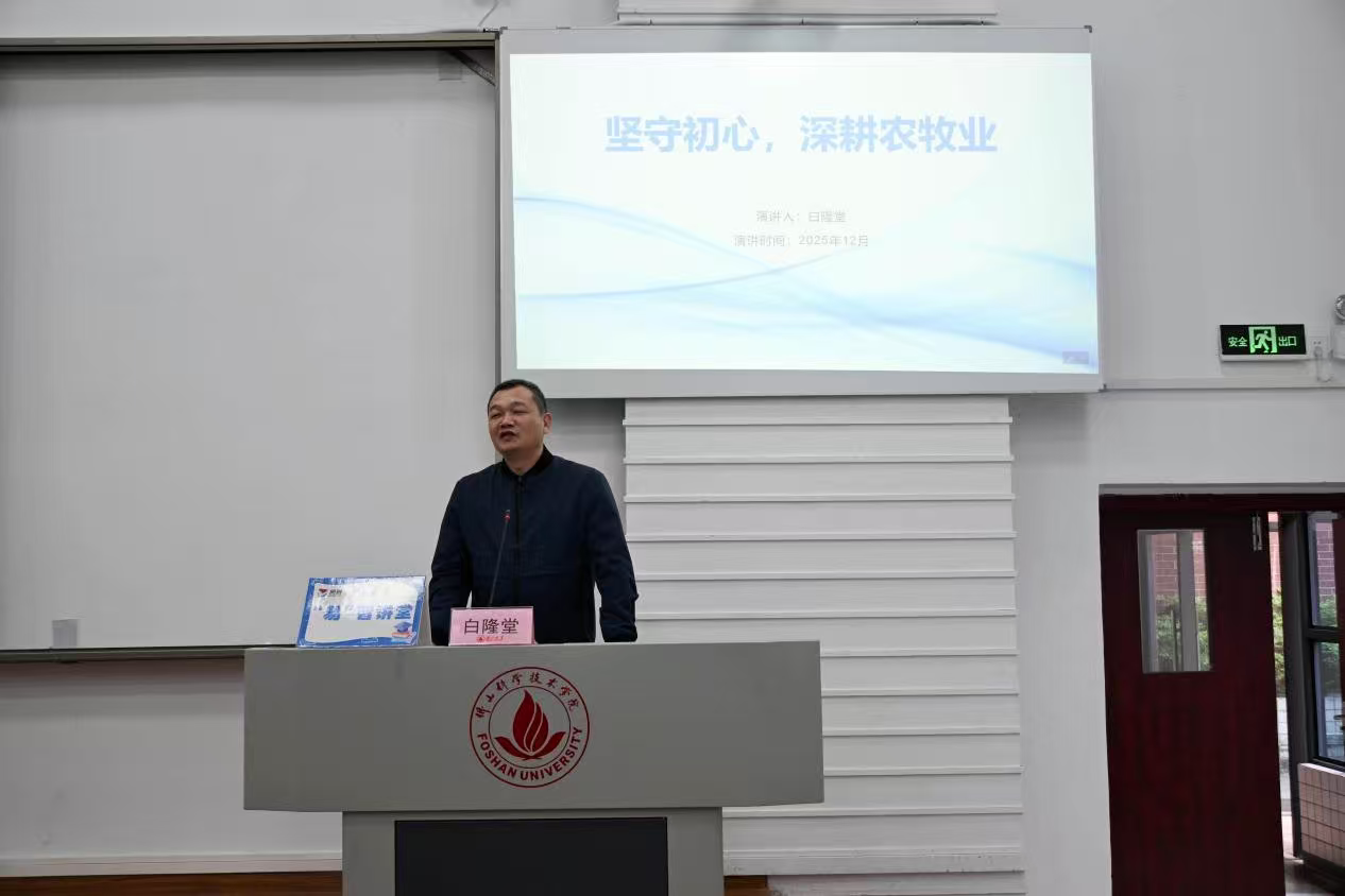 2025年12月26日,佛山大学动物科技学院与温氏股份江西养猪公司校企合作二十周年庆典活动在仙溪校区成功举办。温氏集团白隆堂应邀为动科院学子作题为《坚守初心,深耕农牧业》的讲座,系统回顾了自己从求学至深耕农牧业的完整历程,并对行业未来进行了深入剖析,讲座由学院副院长付强主持。