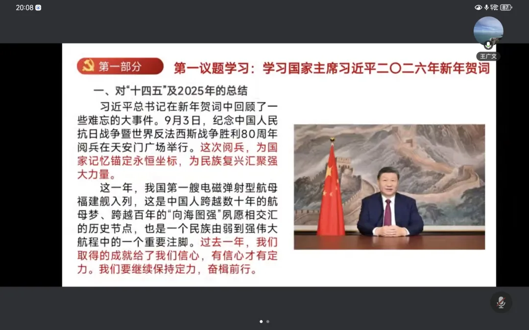 党支部书记王广文带领全体党员进行第一议题学习:学习国家主席习近平2026年新年贺词。党员们共同回顾了 2025 年及 “十四五” 时期辉煌成就,大家深刻认识到,成就的取得根本在于党中央坚强领导和科学理论指引。展望 2026 年 “十五五” 开局之年,党员们表示将牢记嘱托,锚定高质量发展目标,以务实作风在改革开放、共同富裕征程中贡献青春力量。