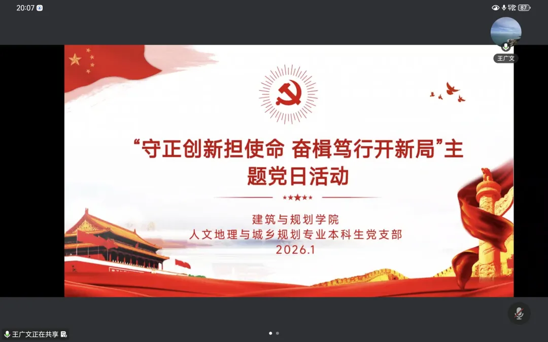 为深入学习贯彻习近平新时代中国特色社会主义思想,巩固主题教育成果、凝聚奋进力量,2026年1月20日,建筑与规划学院人文地理与城乡规划专业本科生党支部以线上会议形式开展“守正创新担使命,奋楫笃行开新局”主题党日活动。