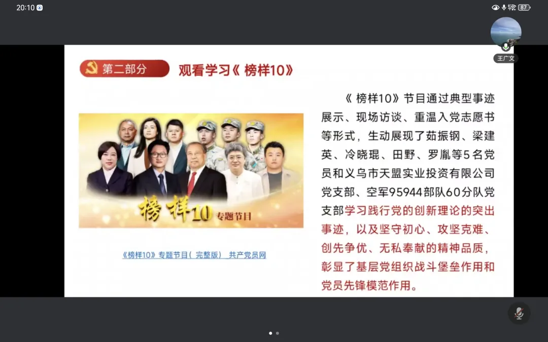 理论学习后,全体党员共同观看学习《榜样10》专题节目。茹振钢、梁建英等 5 名党员及义乌市天盟实业投资有限公司党支部、空军 95944 部队 60 分队党支部的先进事迹令人动容。他们扎根各条战线,或用科技守护粮食安全,或用创新助力基建发展,或用忠诚捍卫家国安宁,以实际行动诠释了坚守初心、攻坚克难、无私奉献的精神品质,彰显了基层党组织战斗堡垒作用和党员先锋模范作用。