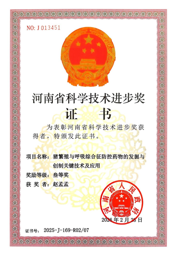 近日,河南省人民政府印发《关于2025年度河南省科学技术奖励的决定》,我院赵孟孟副教授参与的《猪繁殖与呼吸综合征防控药物的发掘与创制关键技术及应用》获得河南省科技进步奖三等奖,其中赵孟孟副教授排名第二,佛山大学排名第二,这是我校在兽医学领域取得的又一重要成果。