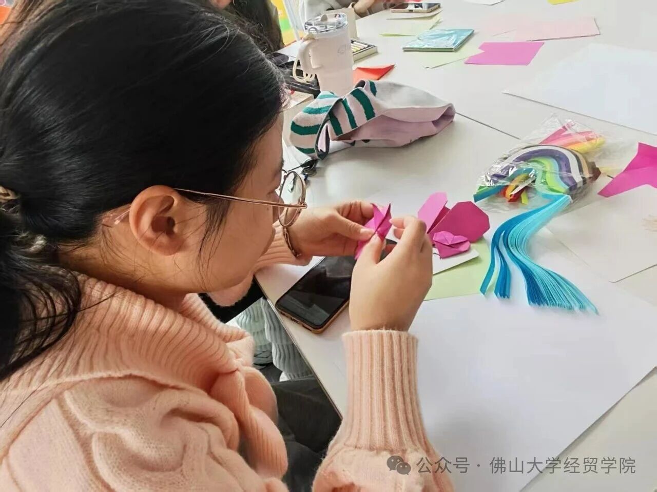 在折纸区,同学们细致地对照教学图样,将彩色卡纸折叠、翻转、压实。从初阶的纸船、星星,到更具巧思的立体花朵,一张张平面纸张在指尖流转间,逐渐变为承载心意的立体作品。不少同学在基础造型上加入创意,用细腻的手工传递质朴而真挚的情感。