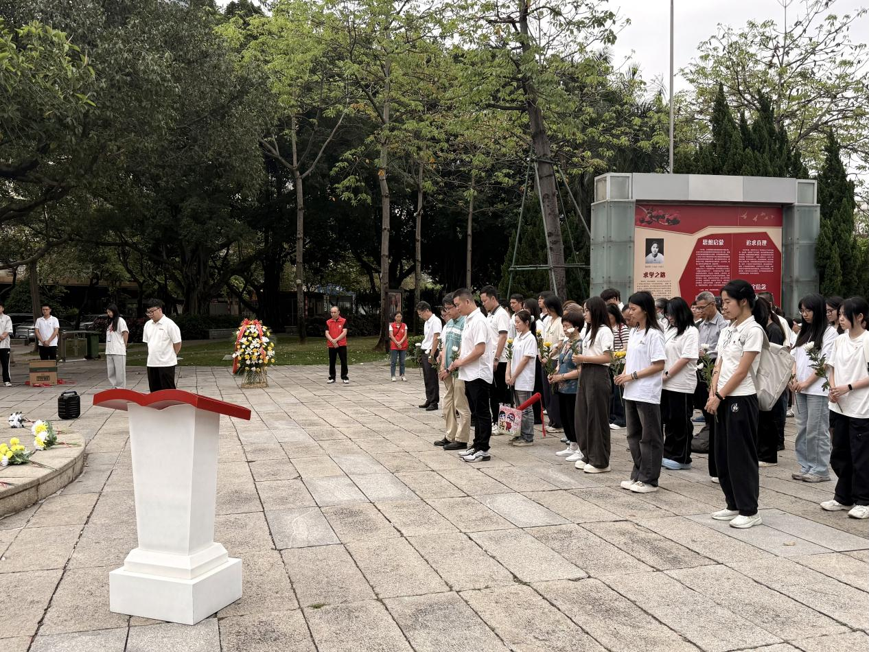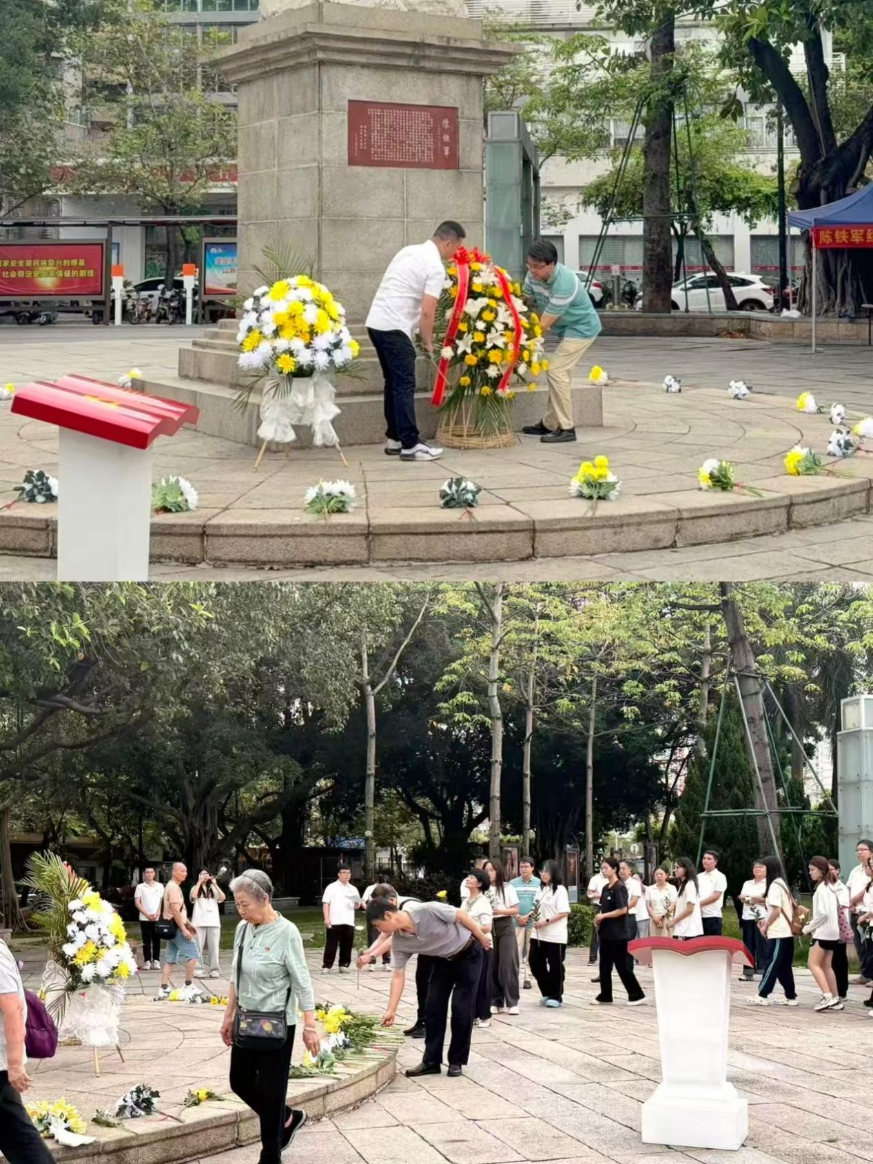 在陈铁军烈士塑像前,全体人员列队肃立、默哀三分钟,向革命先烈致以崇高敬意。默哀毕,佛山大学设计学院党委书记范劲松同志与东便社区党委书记江智锦同志共同向烈士敬献花篮,全体党员、团员手持菊花依次瞻仰致敬、献上鲜花,在庄重肃穆的氛围中缅怀革命先烈、铭记历史使命。