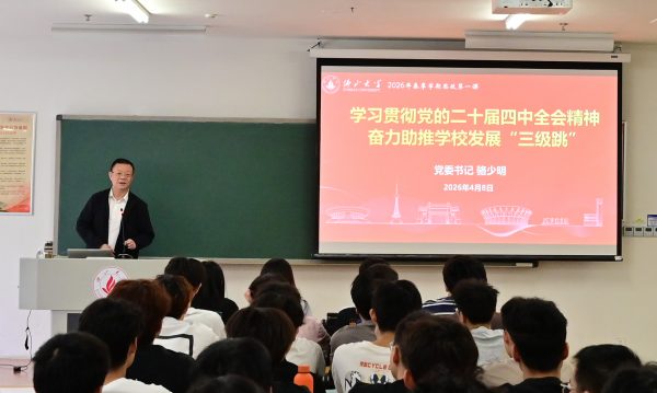 2026年4月8日,学校党委书记骆少明教授在仙溪校区C3-205课室,以“学习贯彻党的二十届四中全会精神,奋力助推学校发展‘三级跳’”为题,为机电学院2024级机械电子工程1-3班学生讲授春季学期“思政第一课”。学校党委副书记、纪委书记许晓珠,党政办、组织部、宣传部、纪检室、教务部、马克思主义学院、机电工程与自动化学院等单位负责人及教师代表共同聆听。