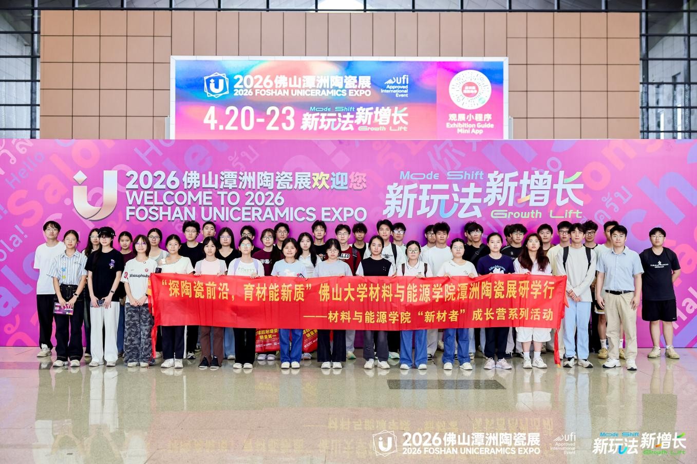 为拓宽学生专业视野、深化产教融合育人模式,2026年4月22日下午,佛山大学材料与能源学院组织40余名本科生前往佛山潭洲国际会展中心,开展“访企·入校·探馆”研学调研活动——“探陶瓷前沿,育材能新质”主题实践。活动由学院辅导员刘任坚老师带队,同学们在这一亚洲陶瓷行业“风向标”的舞台上,开启了一场别开生面的专业实践课堂。