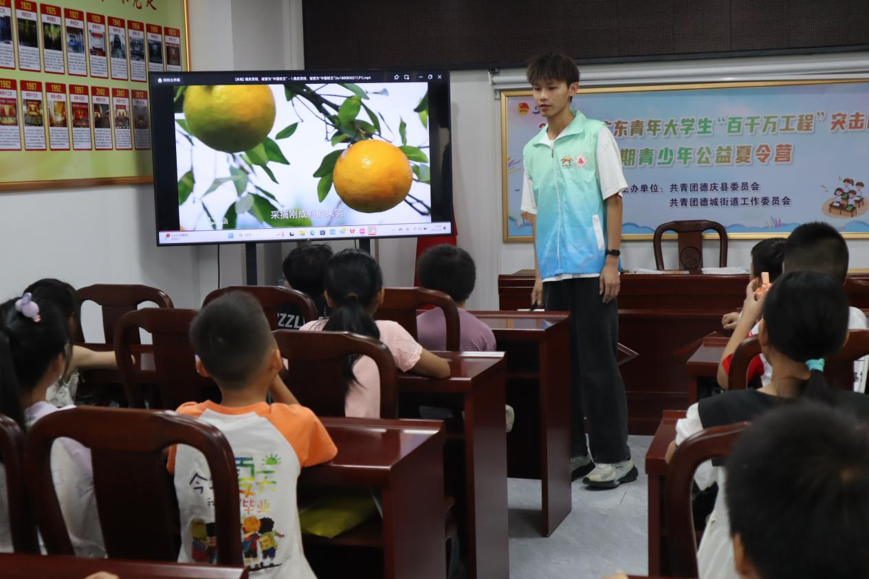 乡村振兴,人才是关键。为了培养德庆县乡村青少年对家乡文化的认同感和自豪感,激发他们对家乡发展的责任感和使命感,“薪火之队”在当地开展了义教课堂活动。在义教课堂上,队员们精心设计了丰富多彩的教学内容,将德庆贡柑、德庆学宫、龙母祖庙等本地特色农业和文化元素融入其中。他们通过生动有趣的讲解、互动游戏、动手实践等形式,让孩子们深入了解家乡的农业产业和历史文化,引导孩子们树立正确的价值观和文化观。在贡柑主题课堂上,队员们带领孩子们线上观看贡柑调研片,感悟家乡好果的独特优势;在文化主题课堂上,队员们引领孩子们传唱薪火之队自创德庆非遗歌曲,带领孩子们领略家乡文化的博大精深。义教课堂不仅丰富了孩子们的课余生活,更在孩子们心中播撒下了热爱家乡、传承文化的种子,为德庆县乡村农文旅融合发展培养了潜在的后备力量。
