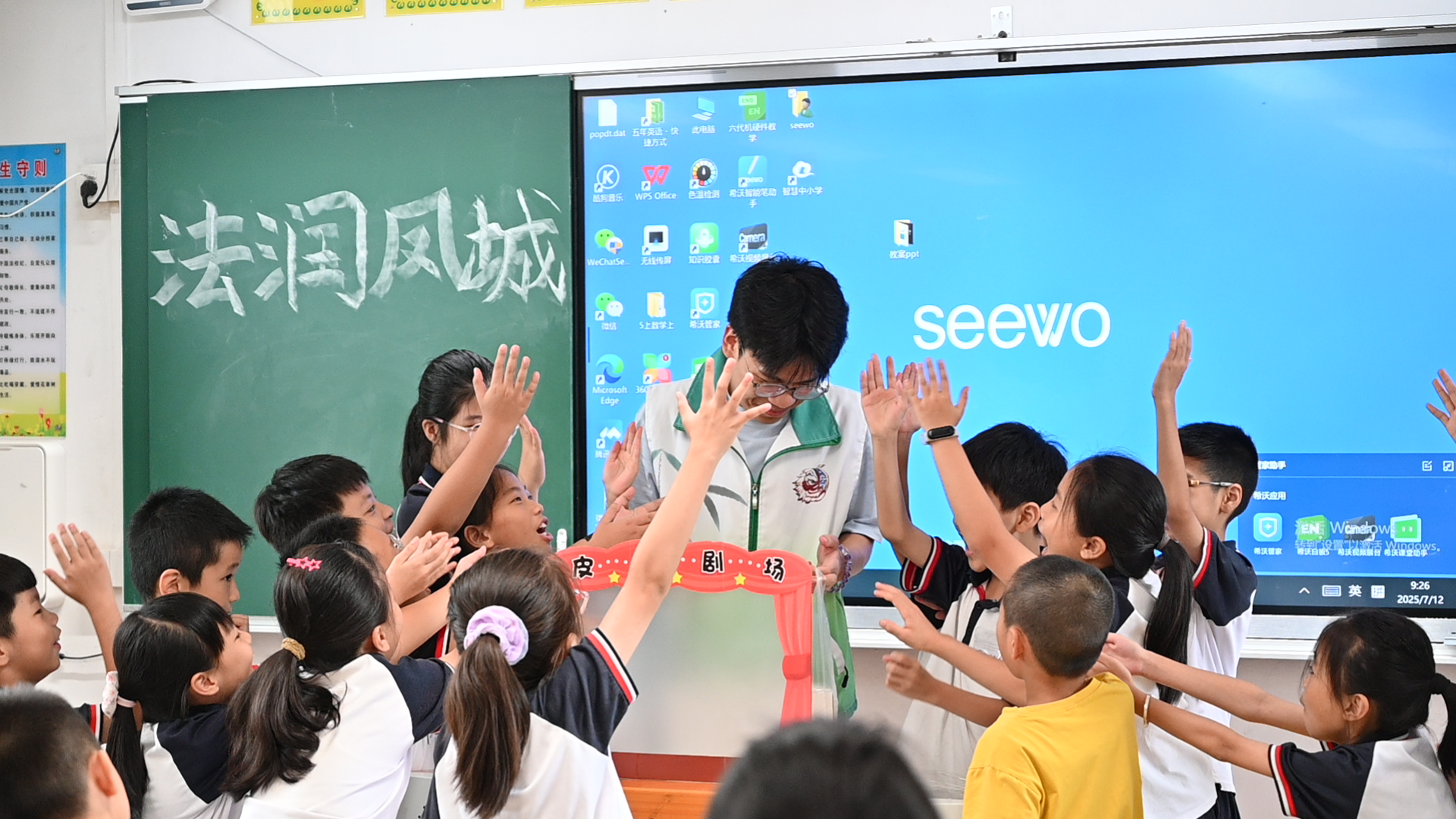 潮州7月16日电(通讯员 肖卓然) 春光小学礼堂的射灯骤然亮起,十岁男孩陈嘉铭手中的铁枝木偶"关羽"突然刀柄滑脱!全场倒抽冷气的刹那,佛山大学"法润凤城"实践队员一个箭步上前,三根钢线在指尖灵巧翻飞,坠落的青龙偃月刀竟在半空划出惊虹弧线——这场潮州铁枝木偶非遗传承课,以惊心动魄的"救场"拉开序幕。30名小学生的瞳孔里,三百岁的木偶正借青春之手重获新生。