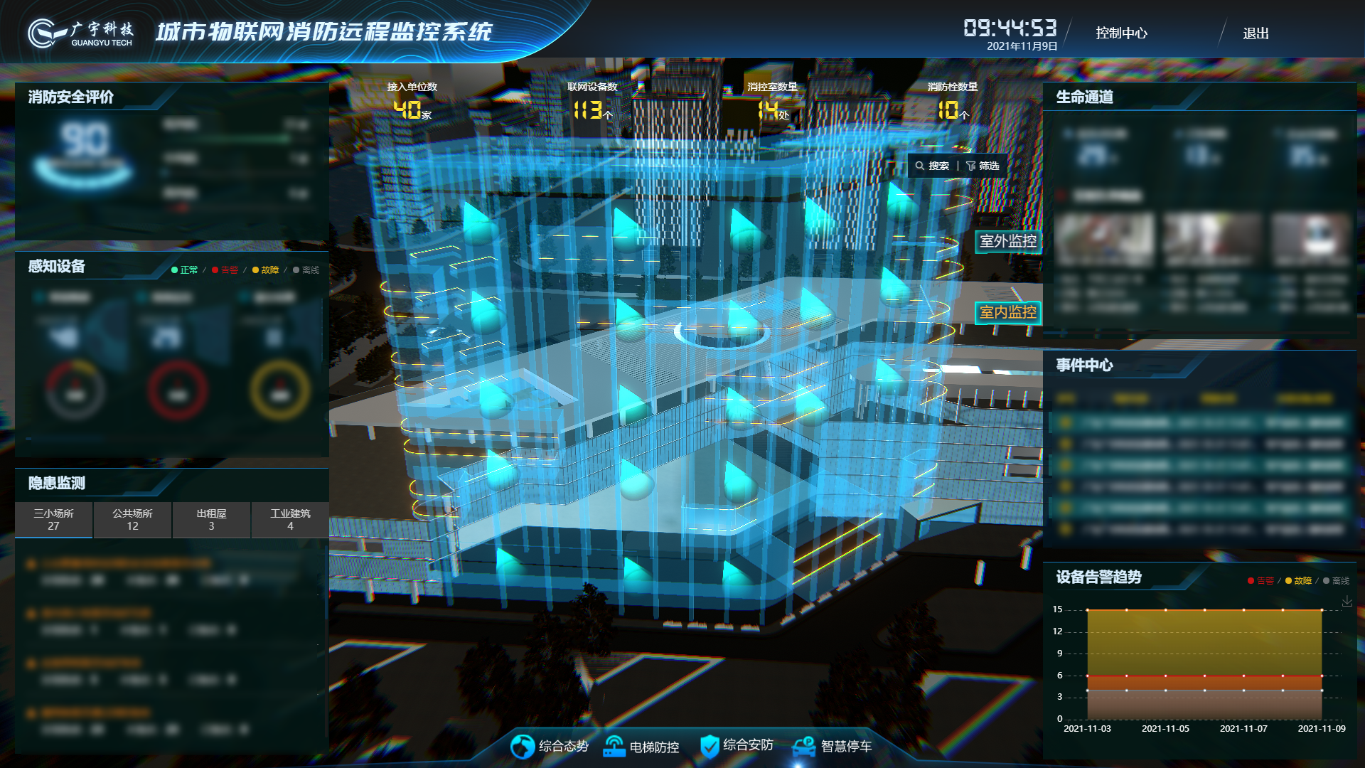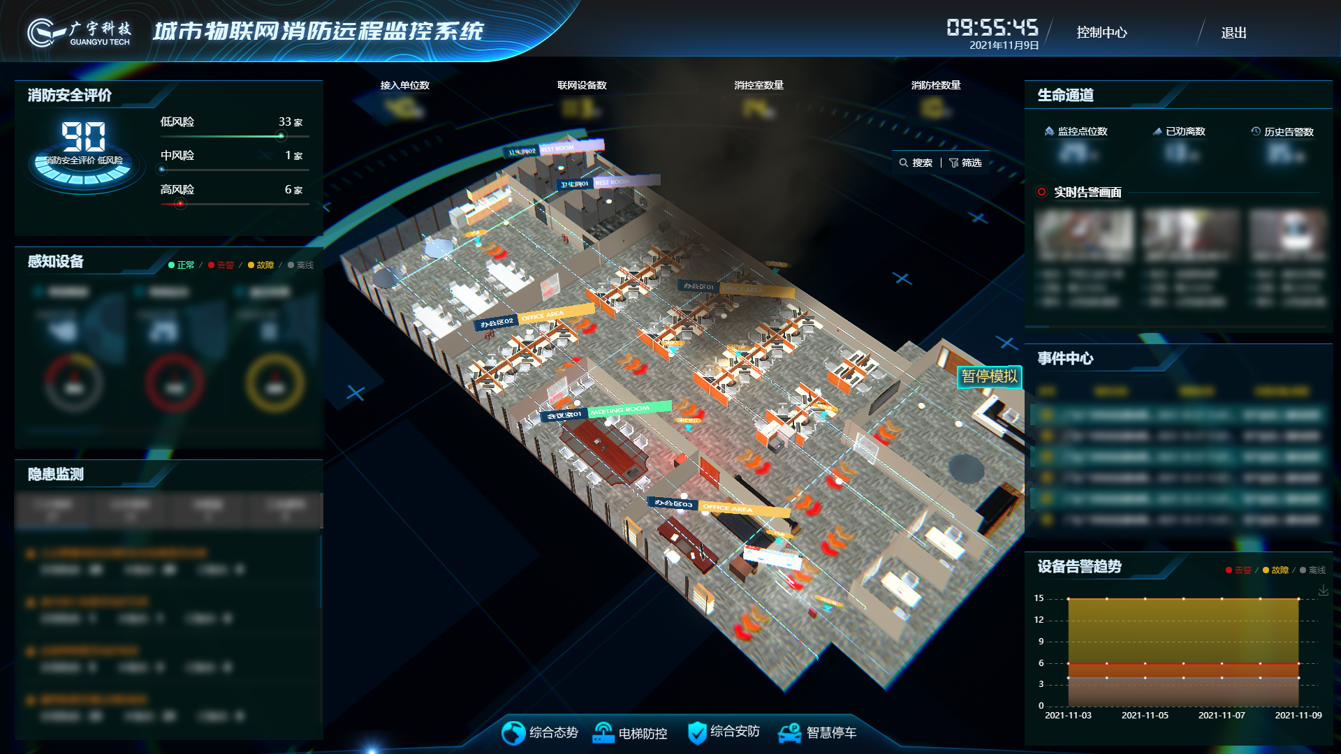 一方面,广宇科技通过整合校园监控视频、门禁系统、消防报警等数据,运用AI算法对校园管理各领域的核心指标进行态势监测与可视分析,实现异常行为识别、人员轨迹追踪等功能;另一方面,广宇科技通过整合烟感、温感、电气火灾监控等各类消防感知设备数据,24小时实时感知烟、电、水、气消防安全状态,实现火灾风险的早期识别和预警。一旦发生火情,系统能够自动启动应急响应流程,包括报警信息推送、疏散路线规划、应急设备联动等,切实提升校园的安全保障能力。