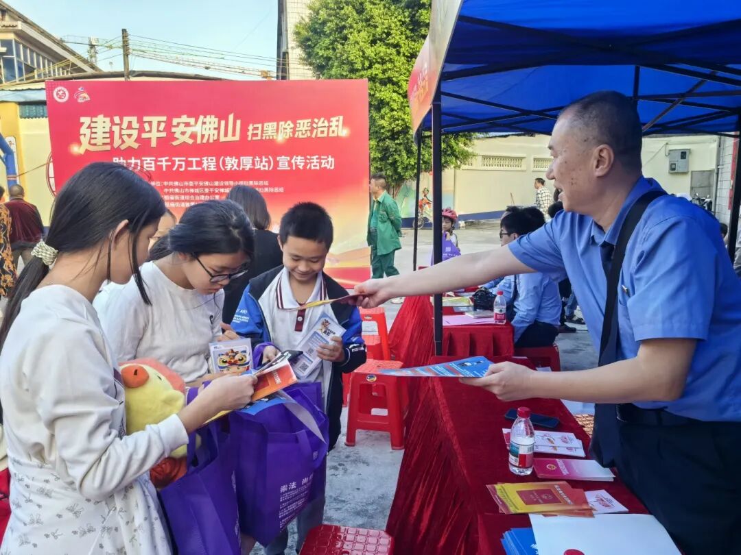 10月,市委平安办、禅城区委平安办等单位在敦厚村联合举办“建设平安佛山 扫黑除恶治乱”主题宣传活动,将传统民俗与现代普法结合,设置扫黑除恶、反邪教、反诈骗、禁毒等宣传摊位,以真实案例绘成四格漫画讲解黑恶势力的常见手法,持续公布扫黑除恶举报方式,受到群众欢迎。