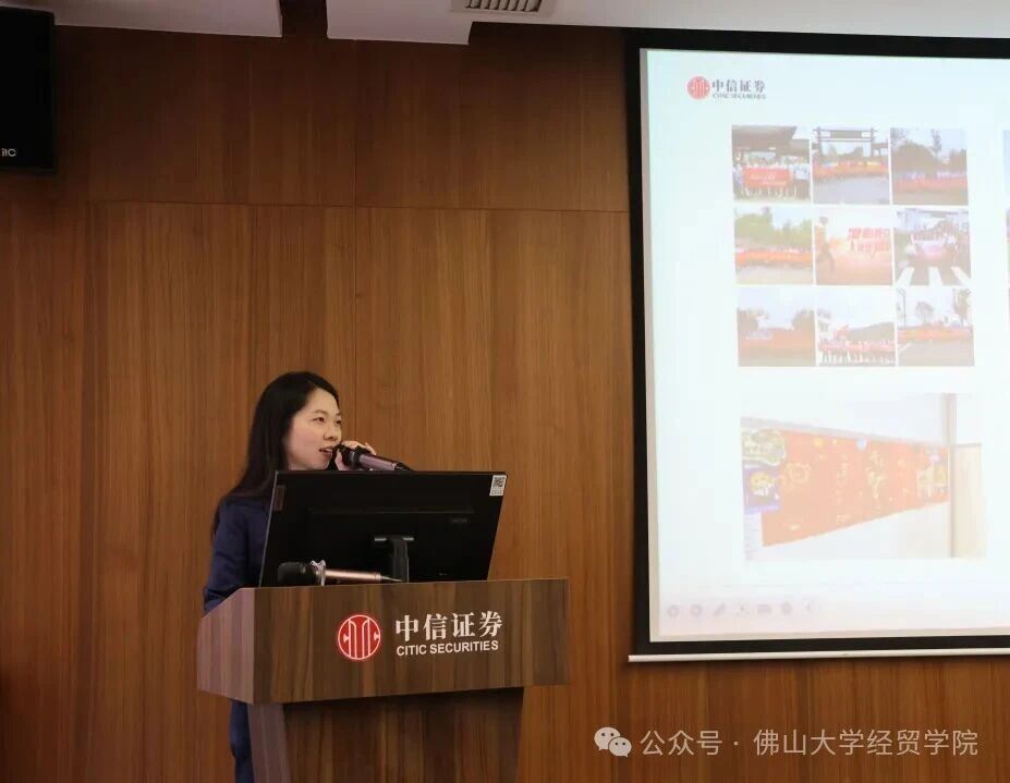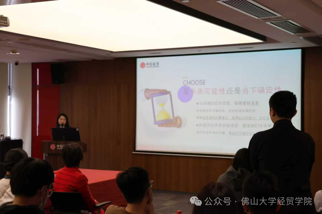作为头部券商,中信证券凭借雄厚的业务规模与广泛的行业布局,给同学们留下了深刻印象。活动现场,公司业务总监黄嘉敏结合岗位职能规划与位同学们细心工作运行安排,为师生们带来了细致讲解。同时,针对同学们高度关注的招聘问题,负责人也进行了详尽解答。