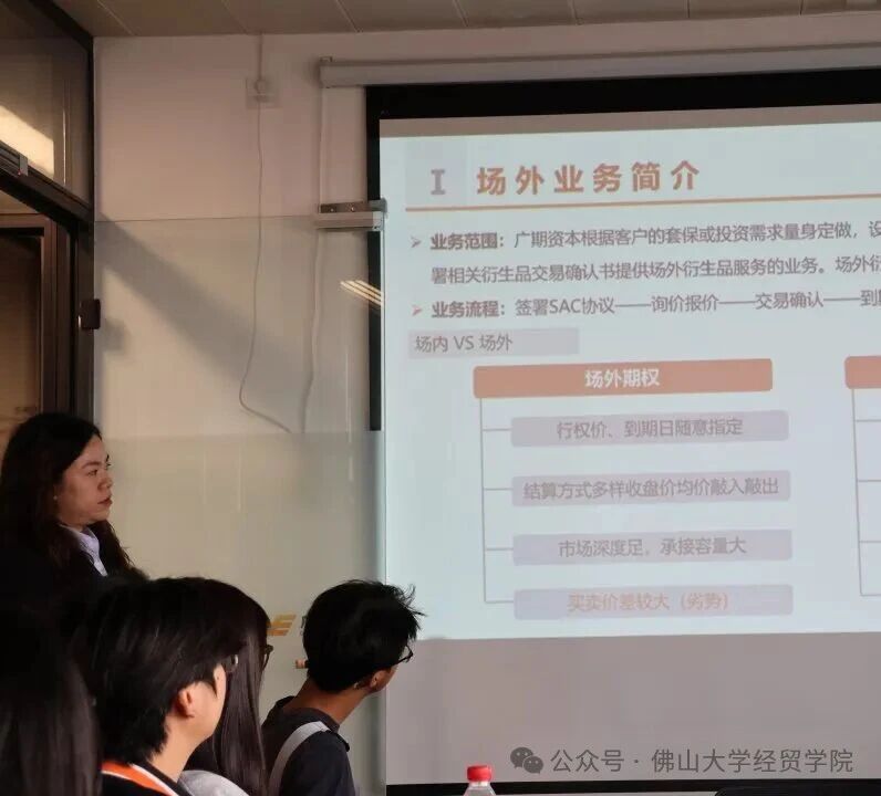 负责产业板块的梁女士等重点介绍了基差贸易、仓单服务、场外业务、含权贸易等核心业务,结合场内外业务运作模式、产业客户套期保值方案设计、基差贸易实操逻辑及含权贸易应用场景等内容,直观展现了 “金融服务实体” 的深度融合路径,使同学们提前了解期货相关内容,更高效地实现了理论知识与实践经验的衔接,同时也为个人职业规划奠定了更扎实的行业认知基础。