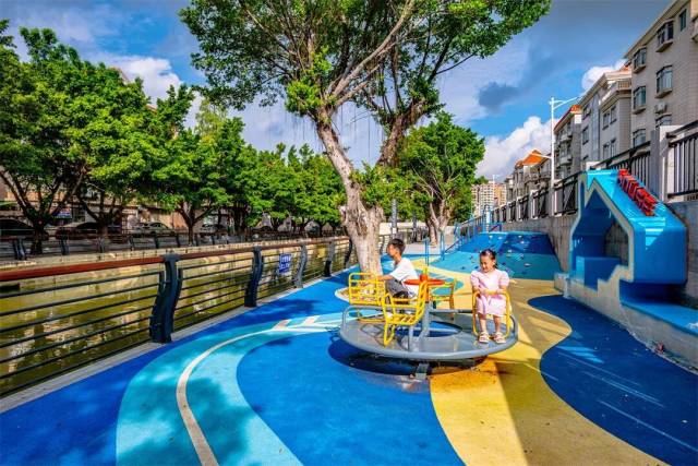 孩子们在美岸后的游乐设施间奔跑嬉戏