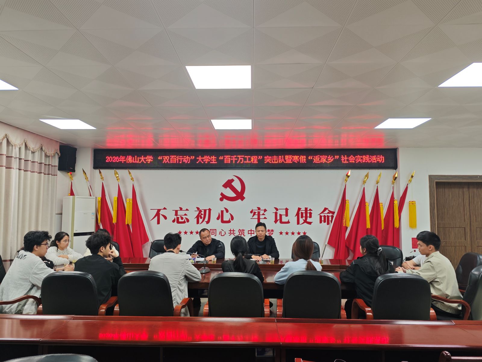 为深入落实广东省“百县千镇万村高质量发展工程”相关部署,2026年1月20日,佛山大学农村科技特派员刘连担任指导老师,带领“渔”跃乡村实践团奔赴云浮市新兴县河头镇,开展寒假“返家乡”社会实践工作。当日直播活动结束后,实践团成员与河头镇领导开展会谈,河头镇领导肯定了佛大学子充分发挥专业优势,扎根乡村的实践担当。双方就大学生返家乡寒假社会实践活动方案展开深入交流。
