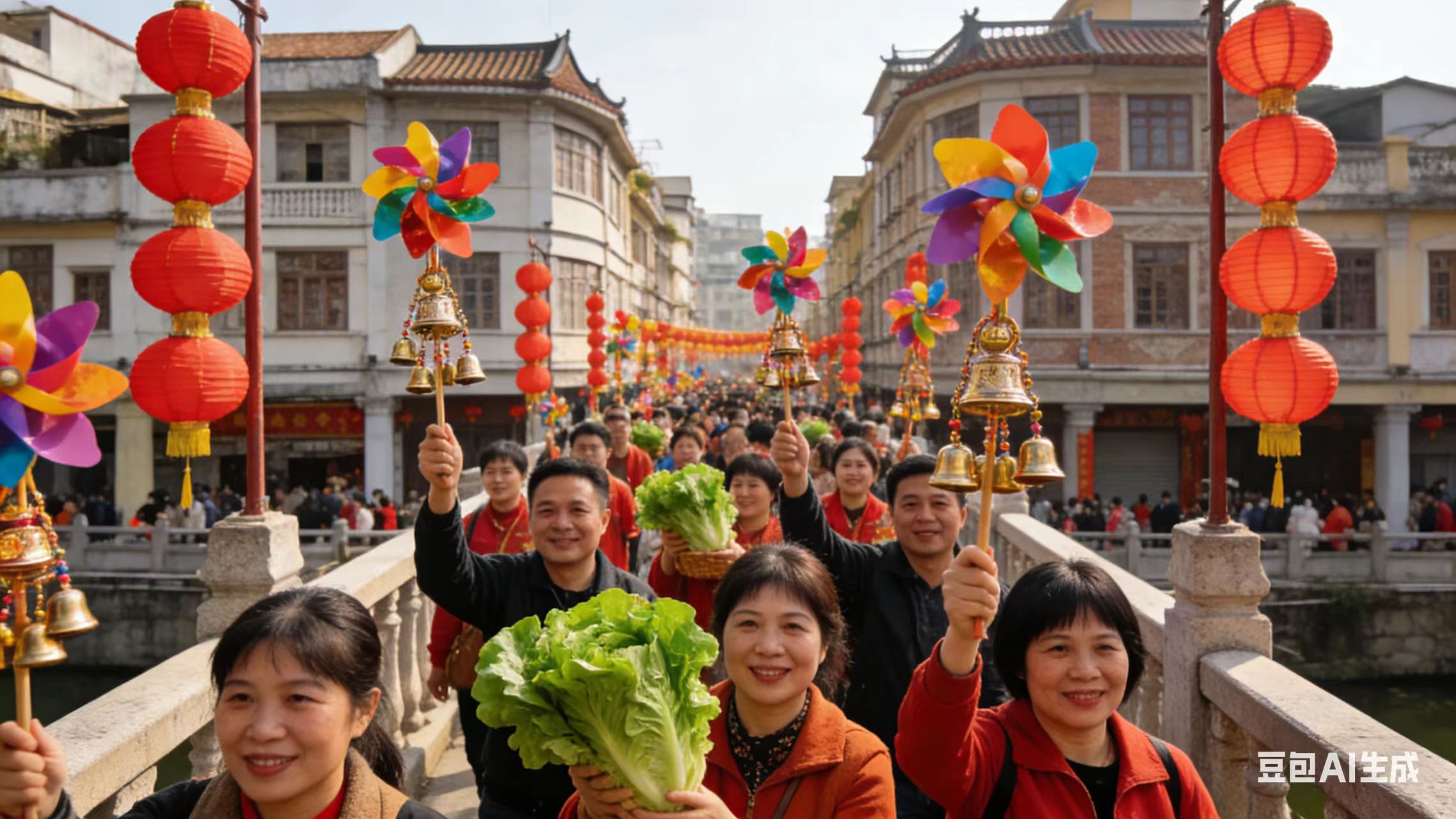这是一场延续了数百年的元宵民俗。每年正月十五,佛山人手持风车、举着风铃、拎着生菜,浩浩荡荡走过通济桥。不是为了看风景,而是为了——把烦恼抛在身后,把好运“转”回家。