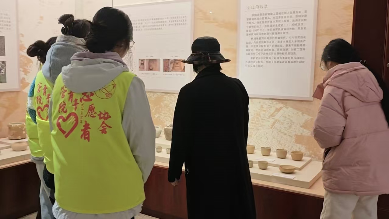 讲解过程中,讲解员结合一线考古工作经历,分享文物发掘背后的故事。她指着展柜中一套保存完整的杯具介绍,发掘时需小心清理覆土,当八件杯具完整呈现时,考古工作者的欣喜与责任感油然而生。这段讲述让成员们真切体会到文博工作者守护历史、传承文脉的坚守。成员们在文物前细致观察、认真记录,在考古故事中理解文物保护的价值,增强文化传承的责任意识。