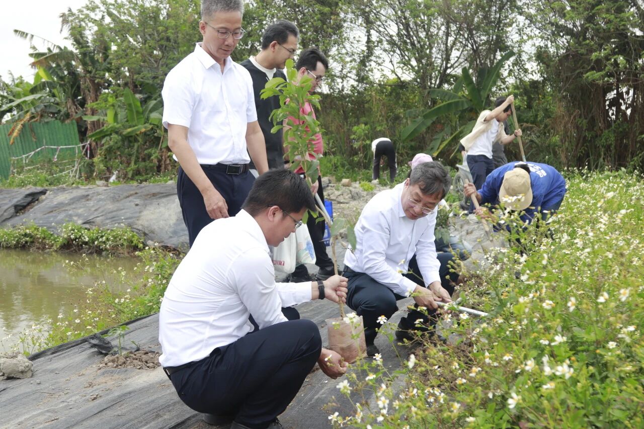 时值第48个植树节,在佛山大学AI+智慧农业基地(农业实习基地)内,一派热火朝天的繁忙景象。物理与光电工程学院领导、教师党员代表与学生党员、学生团员们齐聚一堂,开展了一场以“师生共建添新绿,劳动育人践初心”为主题的植树活动。