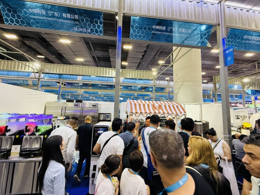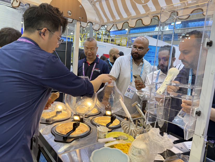 中绅科技(广东)有限公司今年首次参展,一口气带来了制冰机、冷柜、自动冰淇淋售卖机等8个系列产品。最吸睛的是一台绿色智能的意式移动冰淇淋车,被各路客商围着咨询。