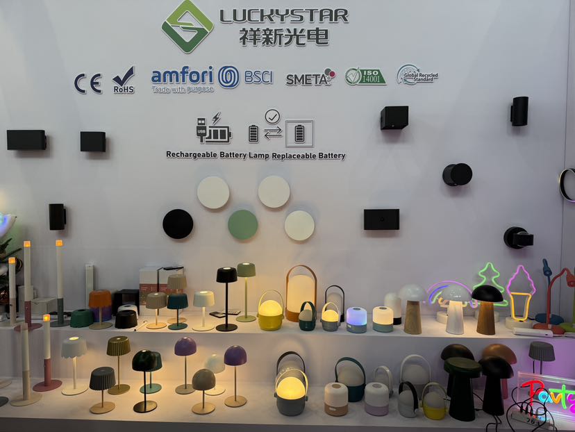 广东祥新光电科技有限公司的展位不算大,但布置得如同一个微型的灯光艺术展。各种造型精巧的装饰灯,色彩多元,能适配不同场景。 其产品最大的特点是智能、节能、长续航。