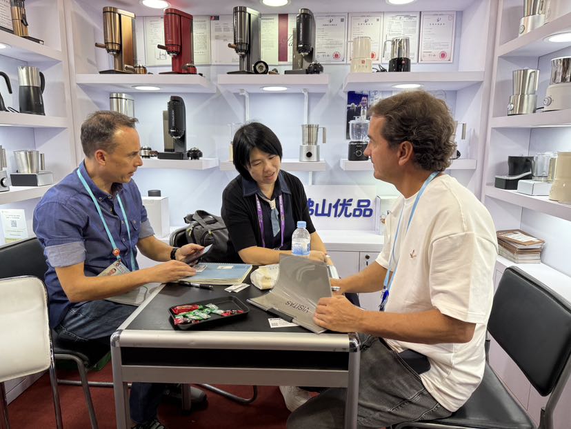 佛山豪捷电器有限公司的展位则飘散着现磨咖啡的香气,奶泡机、咖啡机等产品吸引了不少专业采购商驻足、询价。外贸总监龚伟说:“昨天开幕首日已经有俄罗斯新客户现场下单,今天又开拓了日本意向客户。”