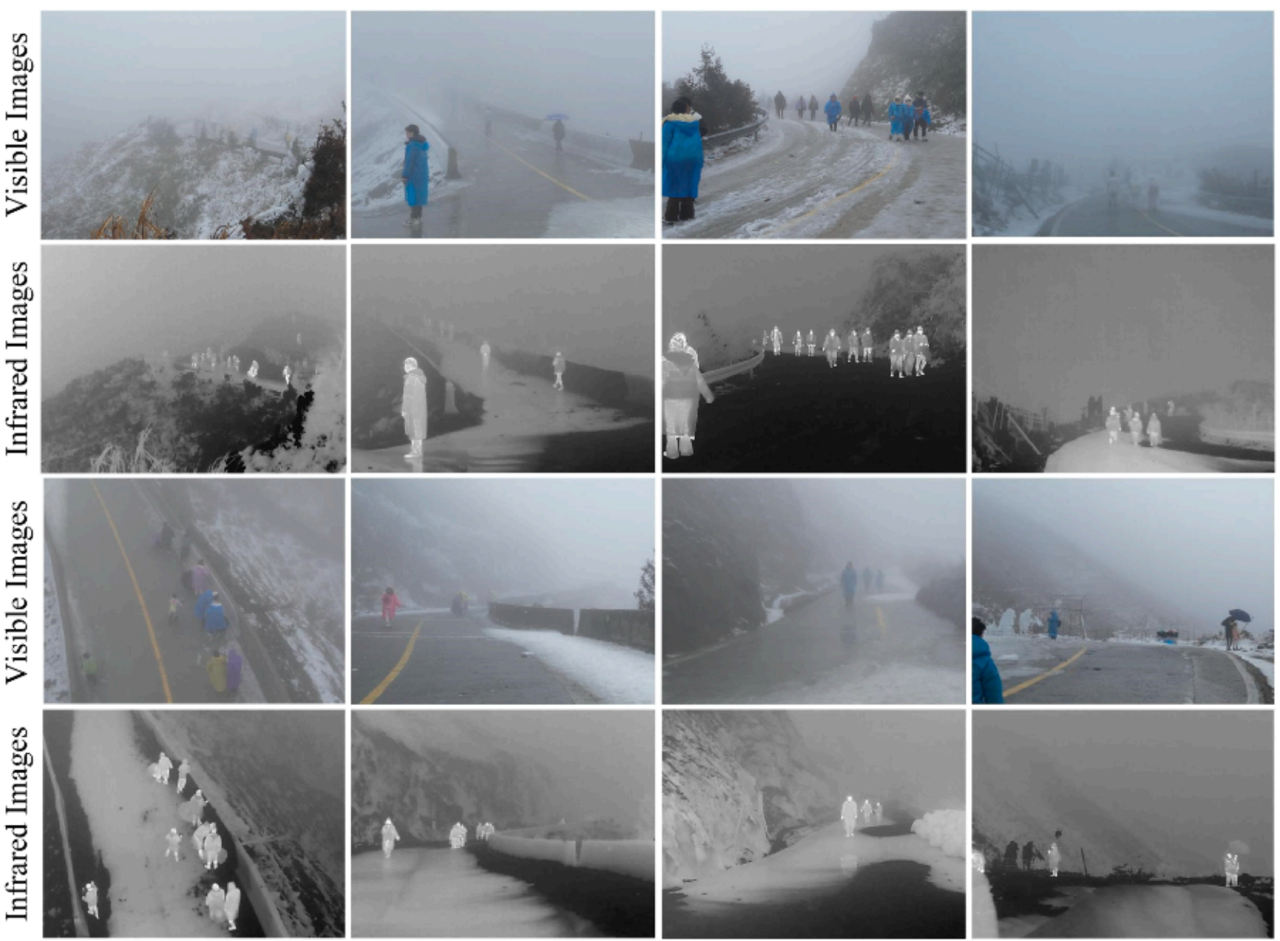 多模态图像融合走向真实应用时,真正的“卡脖子”往往不在理想场景,而在雨/雾霾/雪等恶劣环境:可见光严重退化、跨模态信息分布失衡,使得许多方法一旦脱离“理想成像条件”,就难以稳定输出可靠的场景表征。针对这一核心痛点,课题组提出首个端到端统一的全天候图像融合框架 AWFusion,在同一网络中协同完成跨模态互补信息融合与恶劣天气下的结构/纹理恢复,为“融合 + 复原”的一体化建模提供了可行路径。同时,为解决真实场景下高质量数据稀缺的难题,课题组还构建了AWMM-100k大规模无人机视角数据集:包含10万+对红外-可见光图像;覆盖雨/雾霾/雪三类天气、轻/中/重多级退化;同时包含合成+真实场景,并提供目标检测标注。在合成退化生成上:雾霾采用经典管线生成;雨/雪则从真实雨雪视频中提取 mask 用于渲染,以保留雨丝/雪花的自然形态与空间结构,从而提升“合成→真实”的泛化。