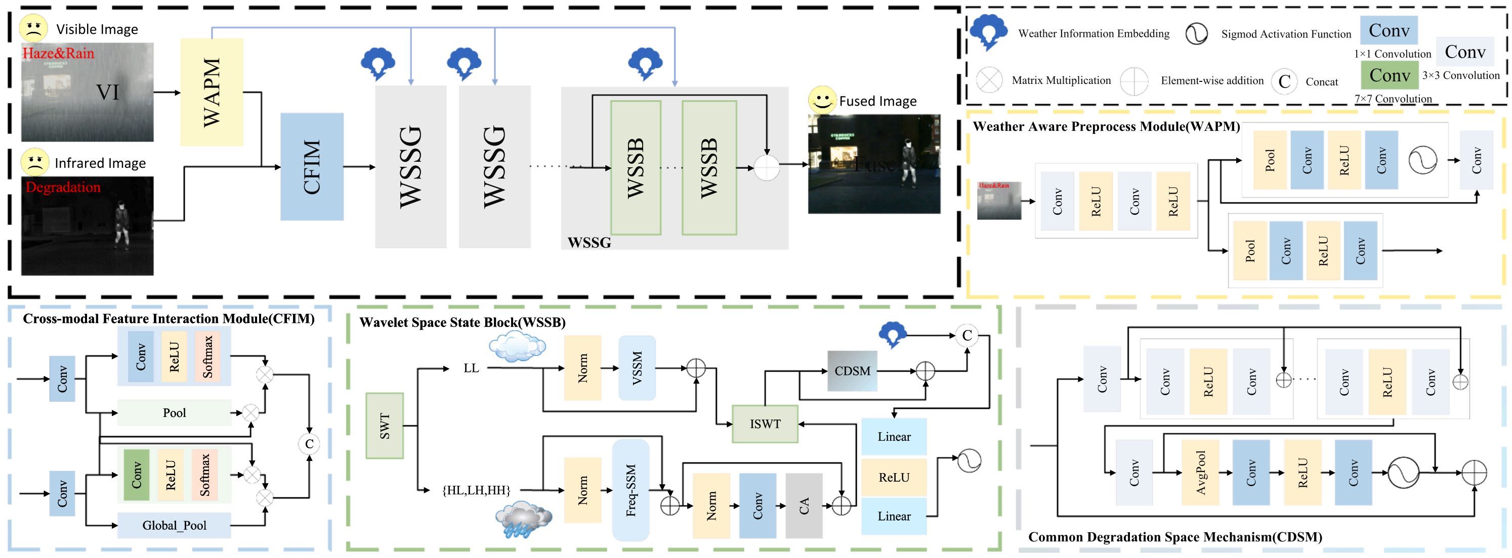 现有恶劣天气图像融合方法大多只能处理单一的退化类型(如纯雾、纯雨或纯雪),在面对复合恶劣天气(如雨+雾、雪+雨并存)时往往会失效 。为此,课题组提出首个能同时处理复合恶劣天气的端到端框架CAWM-Mamba,该模型利用状态空间模型(Mamba)技术,像“滤镜”一样精准剔除多种复合干扰,同时完成图像融合,为无人机和机器人在复杂环境中的稳定感知提供了技术支持。该模型在各种单一与复合恶劣天气下均展现出了卓越的融合鲁棒性,并在下游高级视觉任务中表现优异。