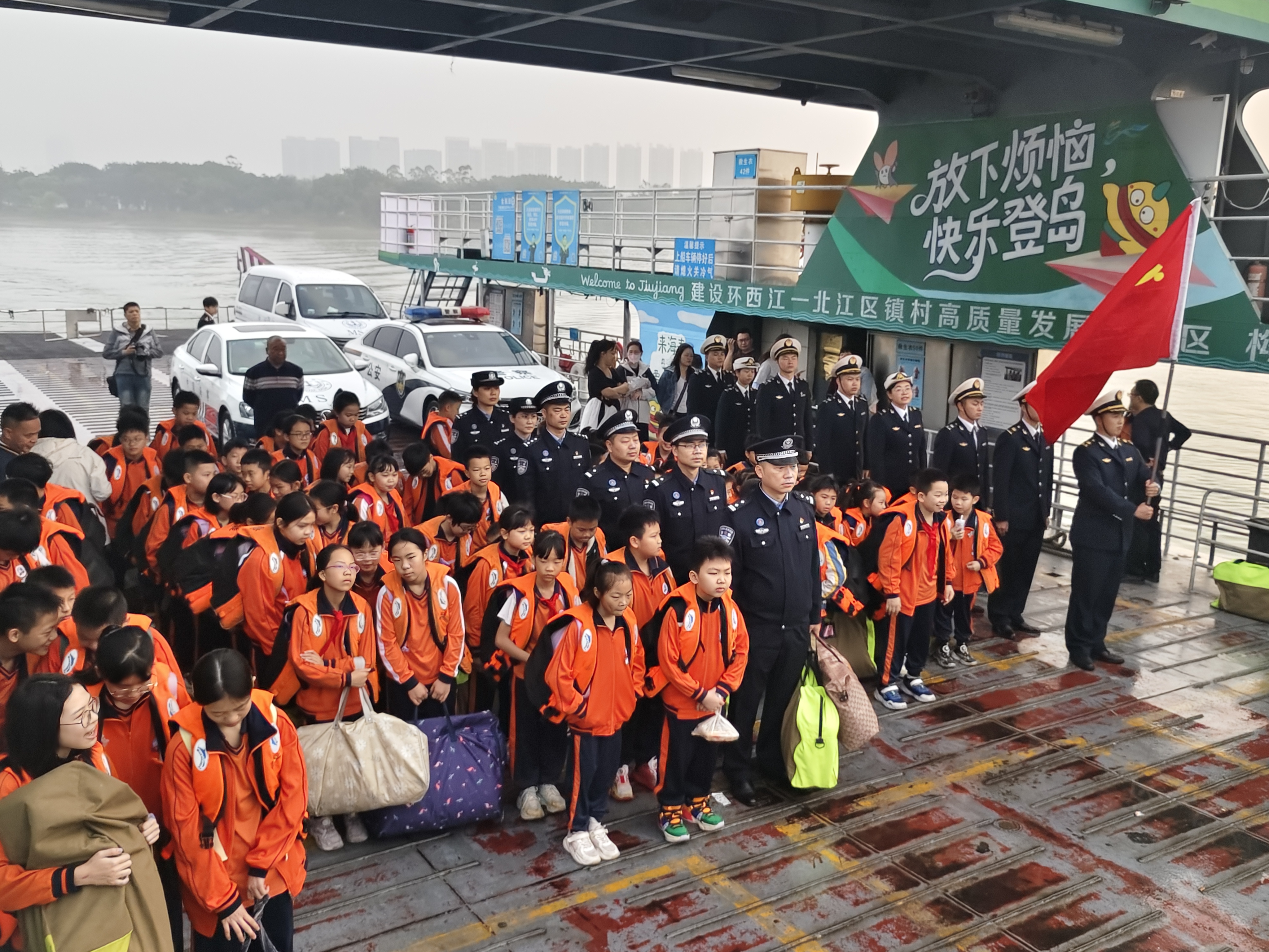 国门卫士守护求学路,西江之畔赓续鱼水情。3月2日,新学期开学首日,佛山市南海区九江镇海寿岛渡口上阵阵稚嫩的童声和庄严的国歌声交相辉映。佛山边检站执勤二队志愿服务队联合佛山海事局团委走进海寿小学,开展护航学生渡主题活动,为岛上40余名学生送上了一份特别的“开学礼”。